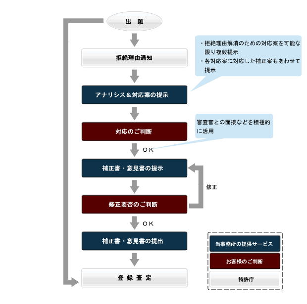 対応方針が決まったら、当事務所で意見書案、補正書案を作成し、お客様に提示致します。また、対応の方針は決まったが、登録されるかご心配の場合は、当事務所が審査官に電話連絡や面接審査を申し入れ、確実に権利化がなされるよう努力致します。